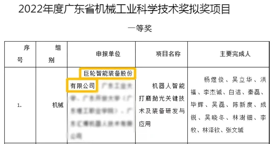 發布時間:2023-03-11近日,廣東省科學技術廳、廣東省機械工程學會分別發布《2022年度廣東省科學技術獎擬獎公示》、《2022年度廣東省機械工業科學技術獎項目公告》,巨輪(廣州)機器人與智能製造有限公司牽頭完成的 “機器人智能打磨拋光關鍵技術及裝備研發與應用” 項目榮譽上榜,分別獲評2022年度廣東省科學技術獎之科技進步獎二等獎,2022年度廣東省機械工業科學技術獎一等獎。