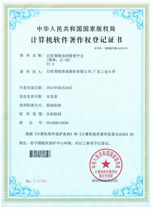 協同管理平台經過近3年的運行,在實際應用過程中不斷完善,並在2016年6月份完成全麵升級,2016年8月獲國家版權局“巨輪智能協同管理平台(V2.0)”軟件著作權登記證書,標誌著公司軟件研發能力的進一步提升,相信隨著信息建設的推進,公司對信息化理念、技術、管理將有更深入的發掘,也將更好的服務公司的生產經營,提升管理品質,達到效益最大化。