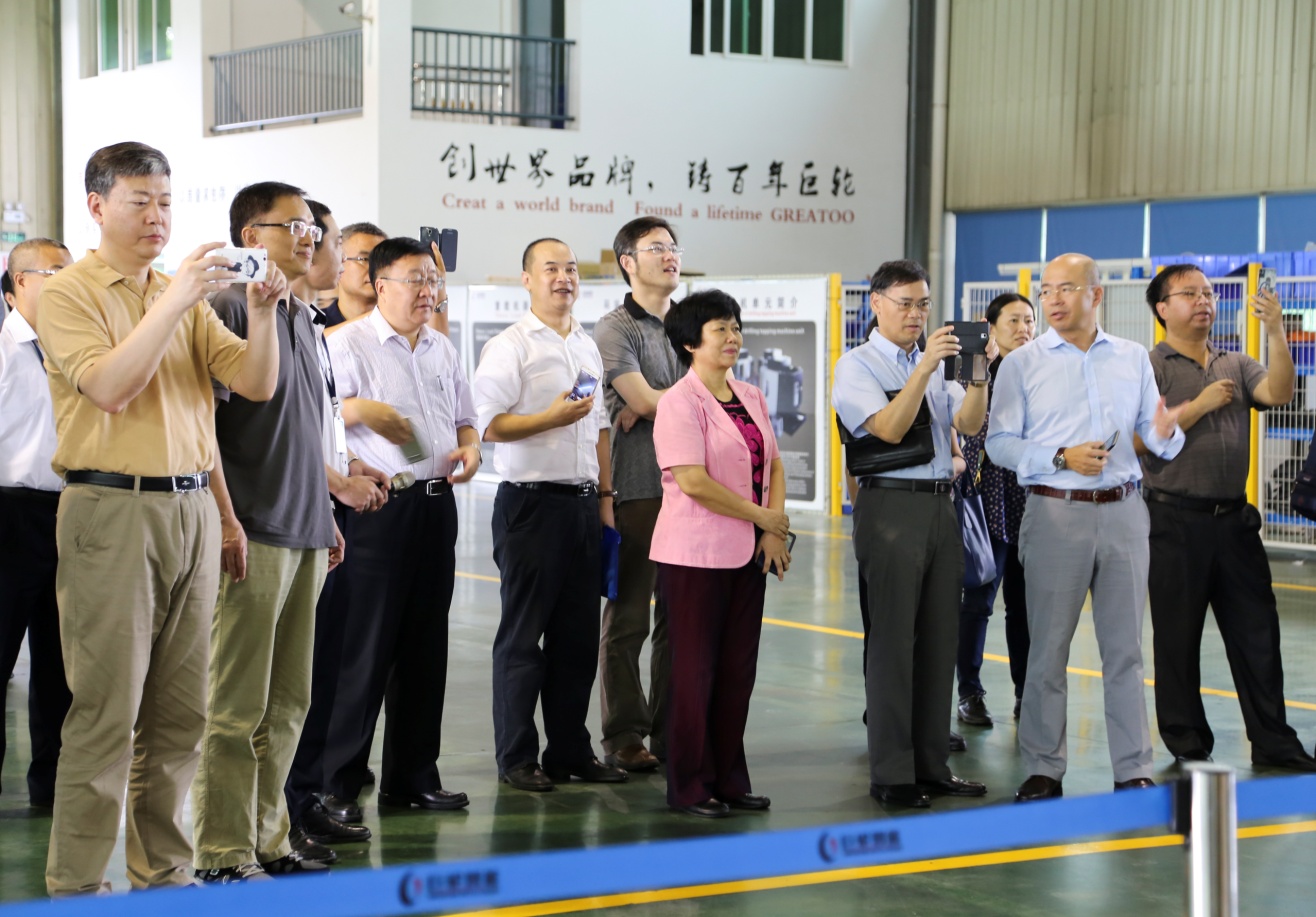 賓主一行參觀了公司的智能化車間及機器人車間,充分感受了工業智能化的魅力。吳董秘向來賓們介紹到:巨輪智能目前擁有輪胎模具、液壓式硫化機、精密數控機床和工業機器人四大業態,是國家技術創新示範企業、國家重點高新技術企業,實現了製造智能化、管理數字化、產品品牌化、市場國際化。公司在北京、廣州等地設立技術研發孵化機構,並先後在印度、德國、美國等國家設立子公司,形成嶄新的國際化發展態勢。