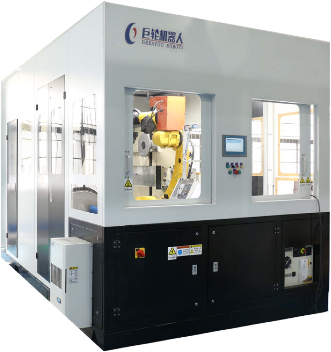 三、智能打磨拋光單元,是密閉式的機器人工作站,由機器人本體、固定上下料台、工裝板、砂帶機以及集成底座組成,配置接觸力補償插件、耗材磨損補償、砂帶糾偏功能,解決產品偏差及耗材磨損問題,確保品質一致、穩定生產。標準單元具有靈活配置、適應性廣,性價比高,供應周期短,快速安裝調試等優勢。