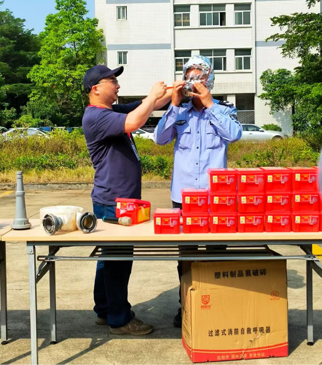 模擬火災現場疏散逃生演練後,消防專業人員現場詳細演示了滅火器、消防水帶以及消防自救呼吸器的正確使用方法和技巧,並組織員工進行實操。受訓人員嚴格按照“一提二拔三握四壓”的操作口訣,成功撲滅了模擬火源,掌握了初期火災撲救的關鍵技能。