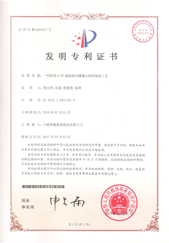 發布時間:2017-03-25近日,公司收到國家知識產權局通知,公司申報的發明專利“一種機器人RV減速器花鍵偏心軸的製造工藝”獲得國家發明專利授權(專利號:ZL 2015 1 0431101.9),標誌著公司機器人核心零部件製造工藝達到國內領先水平。