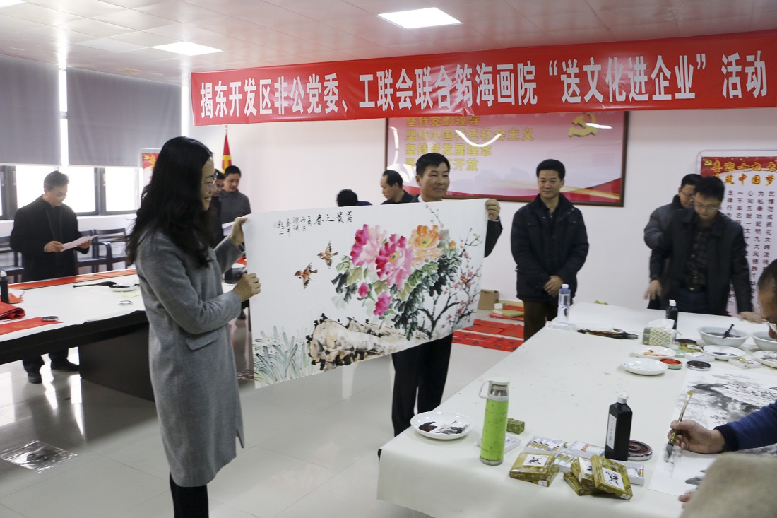 發布時間:2018-01-10帶個福字,回家過年。1月10日上午,揭東開發區非公黨委、工聯會聯合“筠海畫院”在揭東區工業園電商穀二樓舉辦“送文化進企業”活動,為企業職工送去新春的祝福。在我司黨支部、工會的組織下,有不少員工也來到活動現場,近距離觀摩書法家書寫作畫,陶冶文化情操。