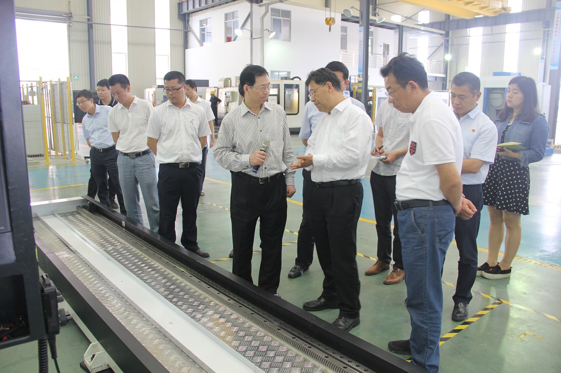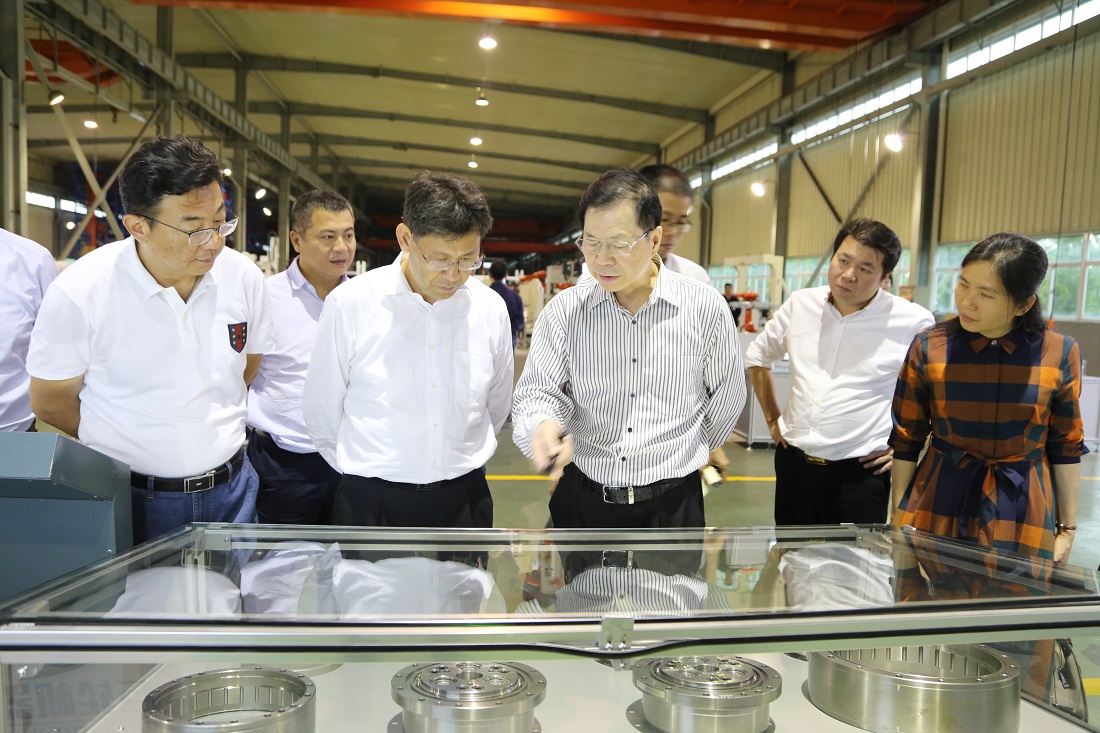賓主一行首先到達我司中德廠區,先後參觀了減速器製造車間、恒溫車間、機器人製造車間,觀看自動化生產線生產運作。吳董事長向葉市長等領導介紹到:巨輪中德智能裝備產業基地自2017年6月份建成投產,主要用於工業機器人、精密加工中心等智能裝備及其核心部件的研發及製造。我司於2009年創建工業機器人研發團隊,經過多年潛心探索,自主研發的工業機器人核心部件RV減速器、控製器取得重大突破,關鍵技術取得國家專利授權,達到國內領先、國際先進水平,目前在工業機器人行業不斷得到推廣應用,我司的智能製造相關產品不少已通過技術成果鑒定,並被評為“國際先進水平”。公司還於今年4月份入選全國首批十五家符合《工業機器人行業規範條件》企業名單。葉市長仔細聽取彙報並表示讚賞,不時就產業發展情況、行內競爭對手等話題與吳董事長進行交流。